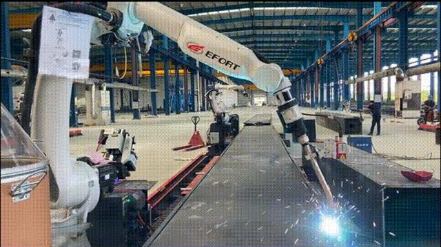 鋼結構焊接工程量巨大、焊接環境惡劣、大型構件作業風險高、焊接勞動強度大,同時,建筑鋼結構構件重復率低、非標件多、節點形式復雜、板材厚度大,傳統的自動化焊接設備很難高效地應用起來。埃夫特依托自主化控制系統,涵蓋從軟件開發工具包(SDK),到融合3D視覺、激光、仿真編程、焊接工藝專家庫等全方位的技術,同時依托埃夫特穩定的弧焊高級工藝包,可實現接觸尋位、電弧跟蹤、多層多道等功能,進而實現無需人工編程示教的智能焊接解決方案。整個方案機器人示教操作工作量降低95%,實現了機器人焊接由“機器人焊接自動化”轉變為“機器人焊接智能化”。